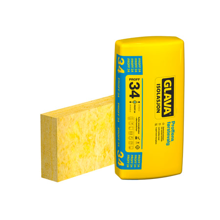 Dette er Glavas hovedprodukt for varme-, lyd- og brannisolering av gulv, vegger og tak i nye og eldre bygninger. 570 mm nominell bredde anvendes til både 36 mm og 48 mm trevirke. Benyttes også til termisk isolering og støyisolering av kjøle- og fryserom, tanker etc. Egenskap ved brannpåvirkning klasse (Euroclass) A1, det vil si ubrennbart. 50 mm Plate/Rull Proff 34 er tilpasset 48 mm trevirke. For 125 mm henviser vi til Proff 34 Rull.