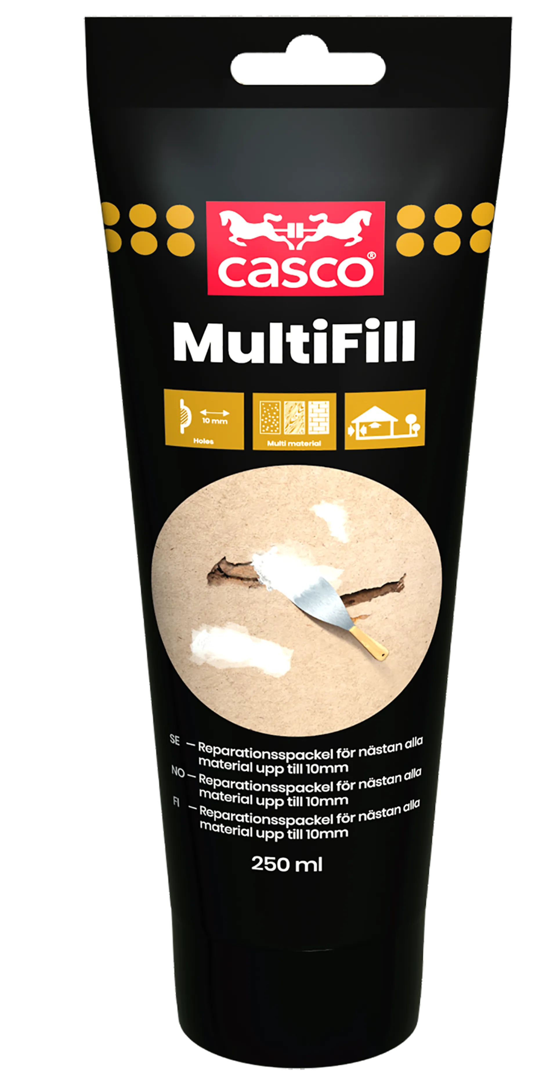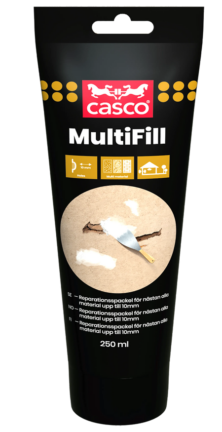 Casco Multifill er en hvit ferdigblandet reparasjonssparkel til reparasjon av nesten alle typer materialer (tre, betong, metall, bygningsplater, mm.). Inne og ute. Fyller hull opp til 2 cm i en omgang. Metall skal alltid forbehandles med primer. Kan ikke brukes på PVC, aluminium eller på flater som permanent er utsatt for fukt.